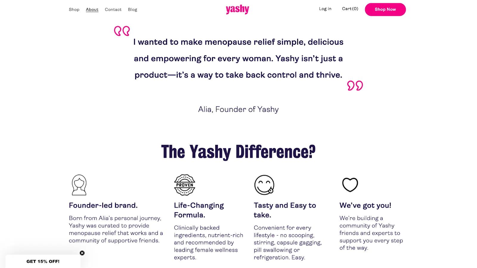 With Yashy, a women's menopause supplement brand, we crafted an About page that reflects their relaxed and approachable personality. Emphasizing the ease and tastiness of their gummies, we highlighted how these supplements offer essential relief in a straightforward, customer-friendly manner. By infusing the founder's genuine, down-to-earth voice, we showcased Yashy’s commitment to making the menopause journey a little easier and more enjoyable.